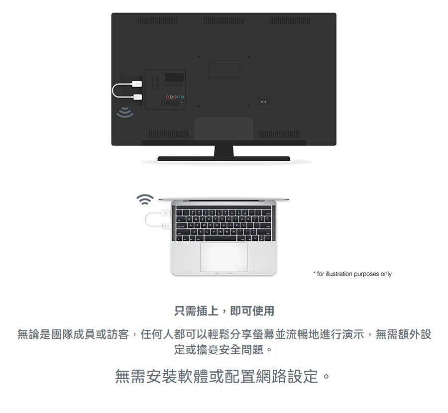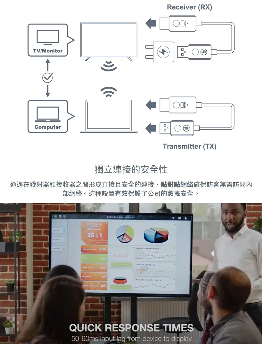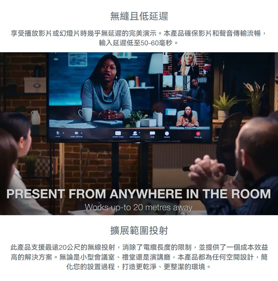 簡單易用的無線協作解決方案。 WHD211支持會議快速設置,輕鬆協作,適應現代工作場所的需求。內容可以通過HDMI連接從任何設備即時傳輸。WHD211無需任何線材或軟件,是免去麻煩的簡報理想解決方案,只需插上即可使用。 由於具有低延遲特性,用戶可以從任何具有HDMI連接的設備投放簡報和其他內容,延遲時間為50-60毫秒,且支持最遠20米的距離傳輸。