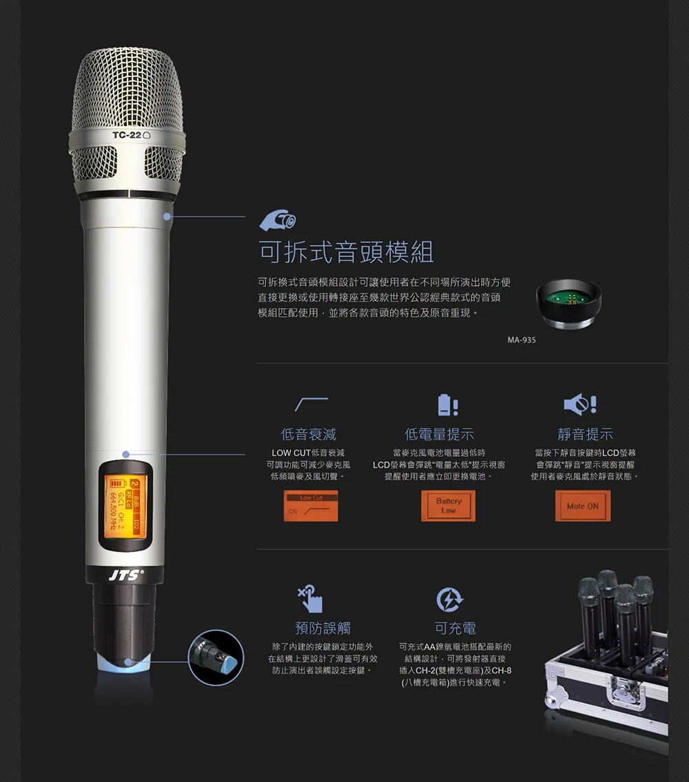 * 搭配最新版JTS專利 功能, 只需一個按鍵便能同時將接收機設定好的資料同步至4支手握或腰掛發射器.