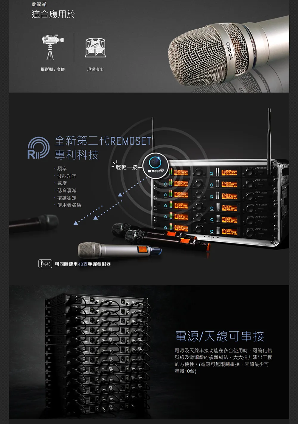 * R-4無線系統搭載JTS最新一代的無線技術不僅能擁有絕佳的無線傳輸效能, 更能在有限的頻寬內提供更多組不受干擾的可用頻道.