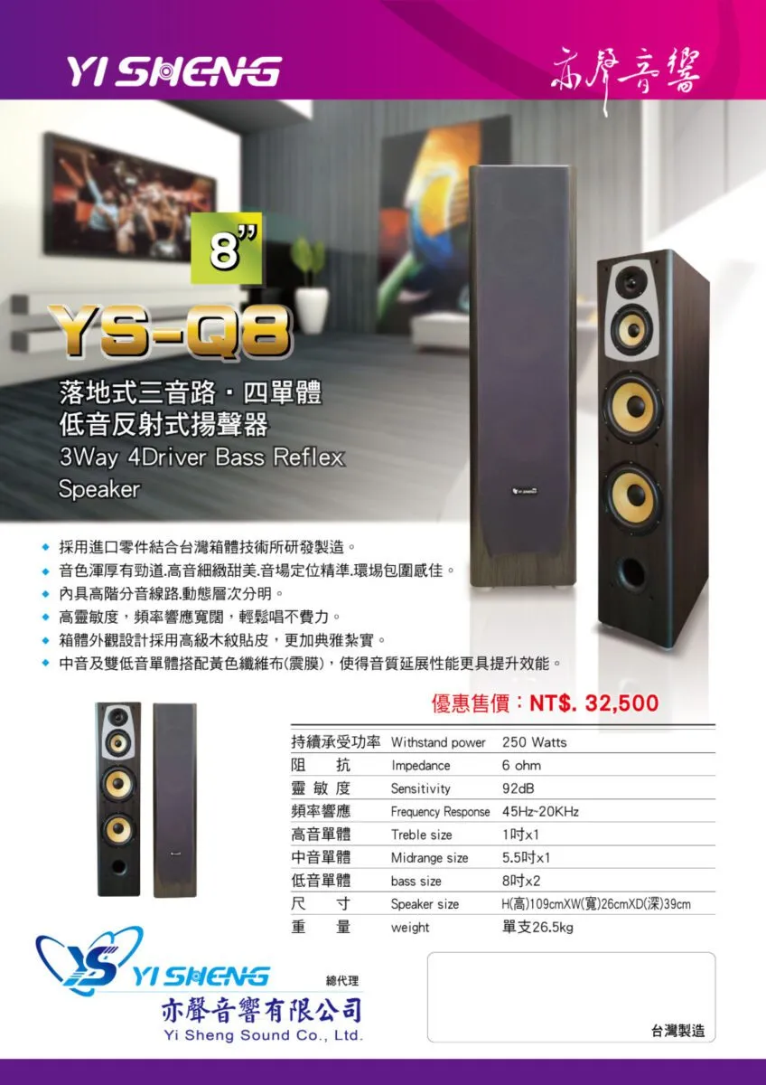 YI SHENG YS-Q8 8吋低音設計 三音路四單體 落地式喇叭