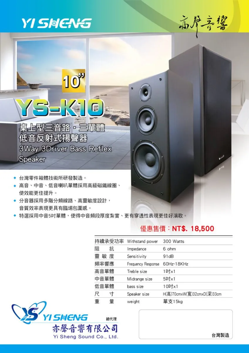 YI SHENG YS-K10 10吋低音設計 三音路三單體 桌上型喇叭