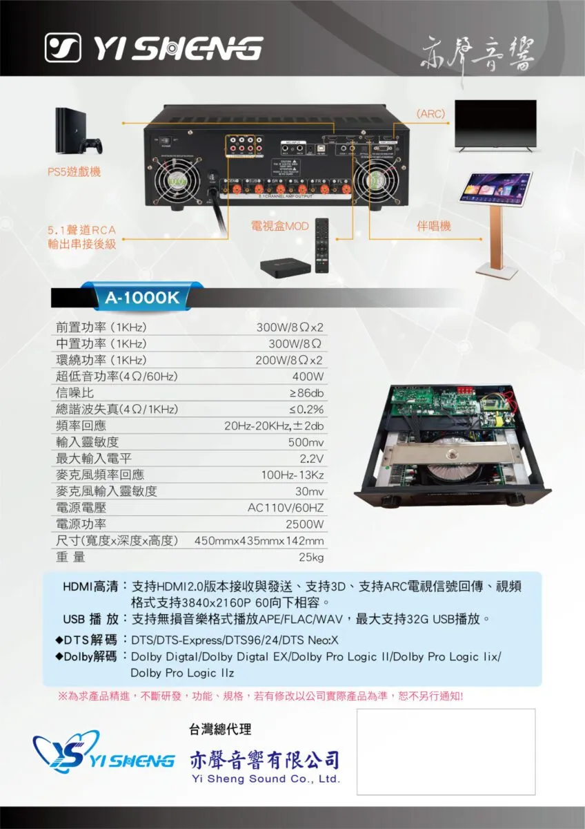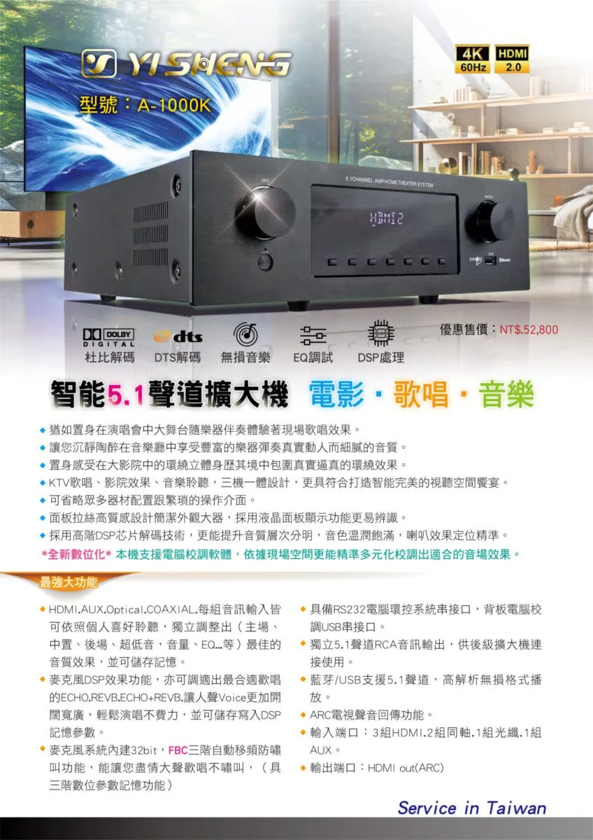 YI SHENG A-1000K 智能5.1聲道 電影、歌唱、音樂 三機一體擴大機!