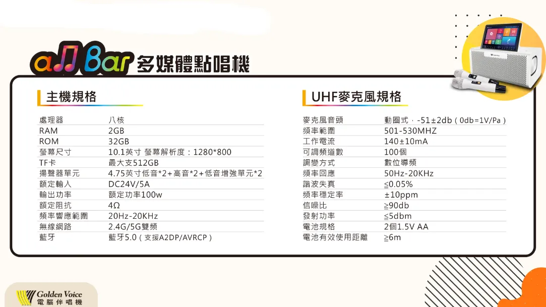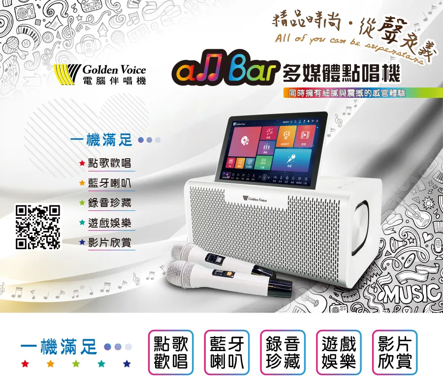 首頁 > 產品總覽 > 音響 / 劇院 > 卡拉OK多媒體 > 金嗓 all Bar 多媒體點唱機 (含4TB硬碟) 可搭配專用行充