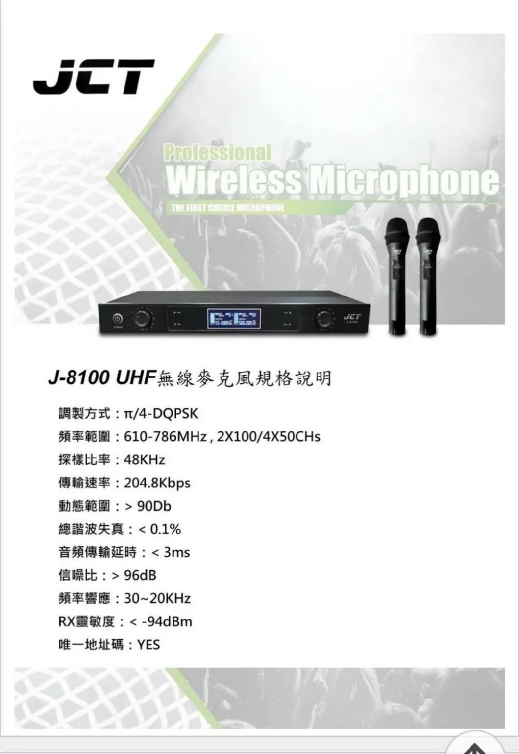 首頁 > 產品總覽 > 音響 / 劇院 > 卡拉OK多媒體 > JCT J-8100 超高頻UHF 無線麥克風